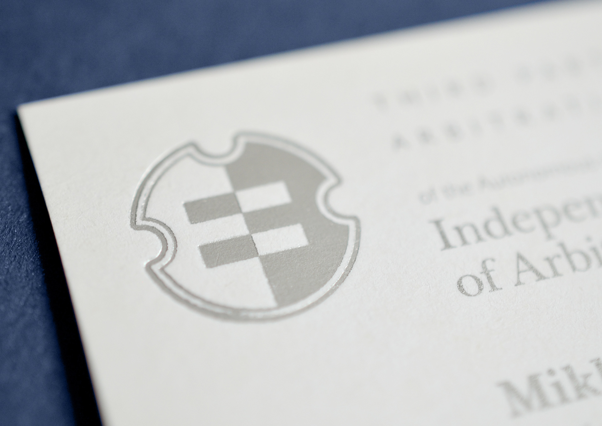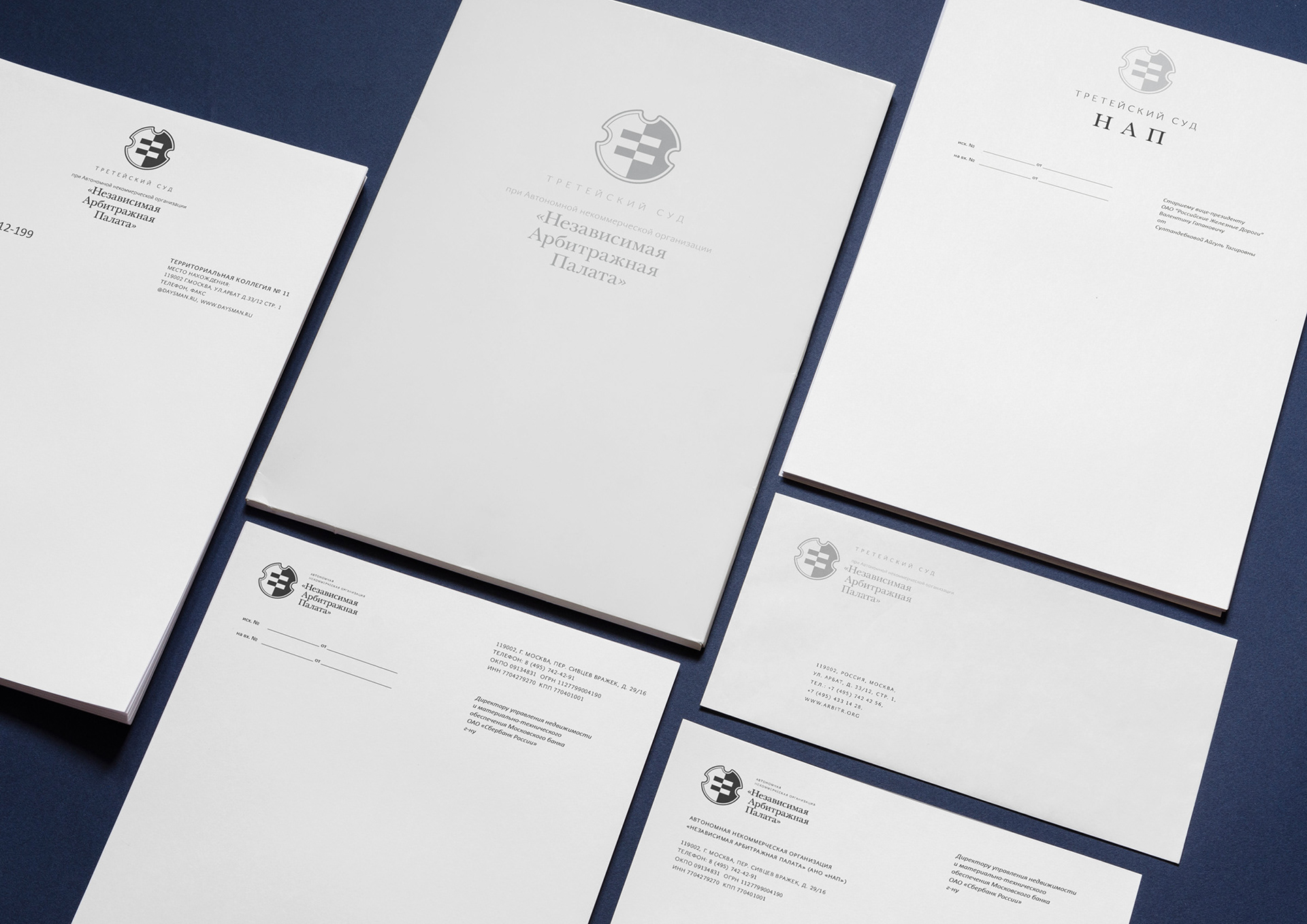 Logo and identity for arbitration court "Independent Chamber of Arbitration" (ICA). ICA's identity bears strong symbolism which is clearer perceived emotionally than rationally. ICA's trademark looks like modern version of a heraldic shield, but it's loaded with meaning, as well as all the other elements of the identity: intricate background pattern signifies trial complexities, twists and turns, contrast of light and dark stands for competition of the parties in trial, accented verison of the logo encased in a framed square is meant to represent final paramount verdict, extensive usage of grey or silver implies neutrality and impartiality of the court.